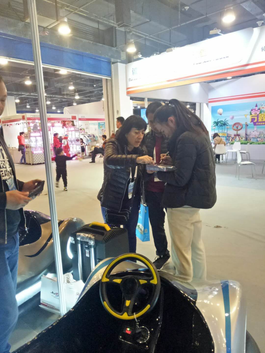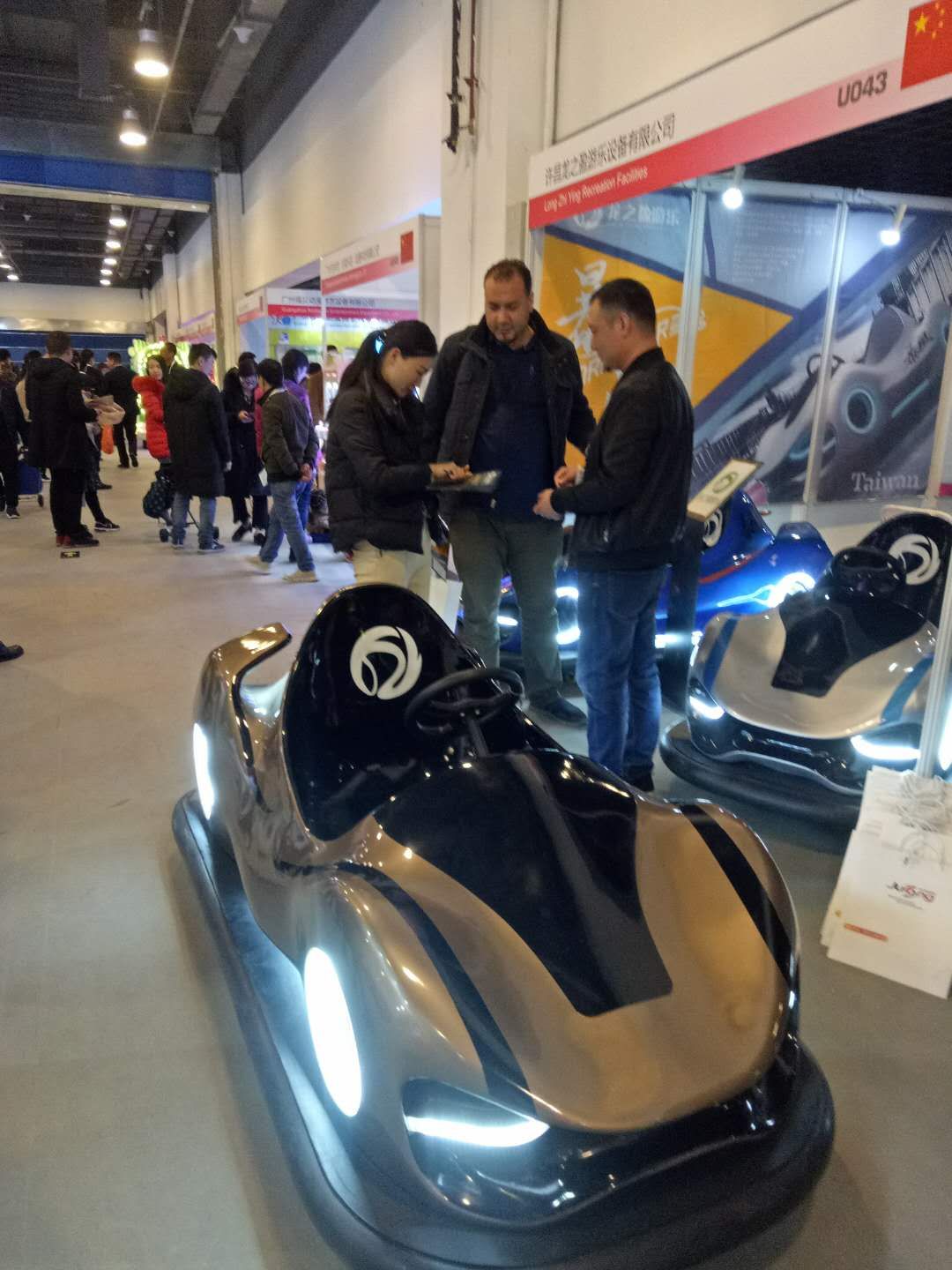 這家展臺的承辦方是龍之盈游樂設備有限公司,而備受關注的產品竟然是一輛碰碰車。當我在這家公司的展臺旁觀看的這段時間里,來來往往詢問著輛碰碰車的人竟不下五十人,其中還包括部分外國友人。